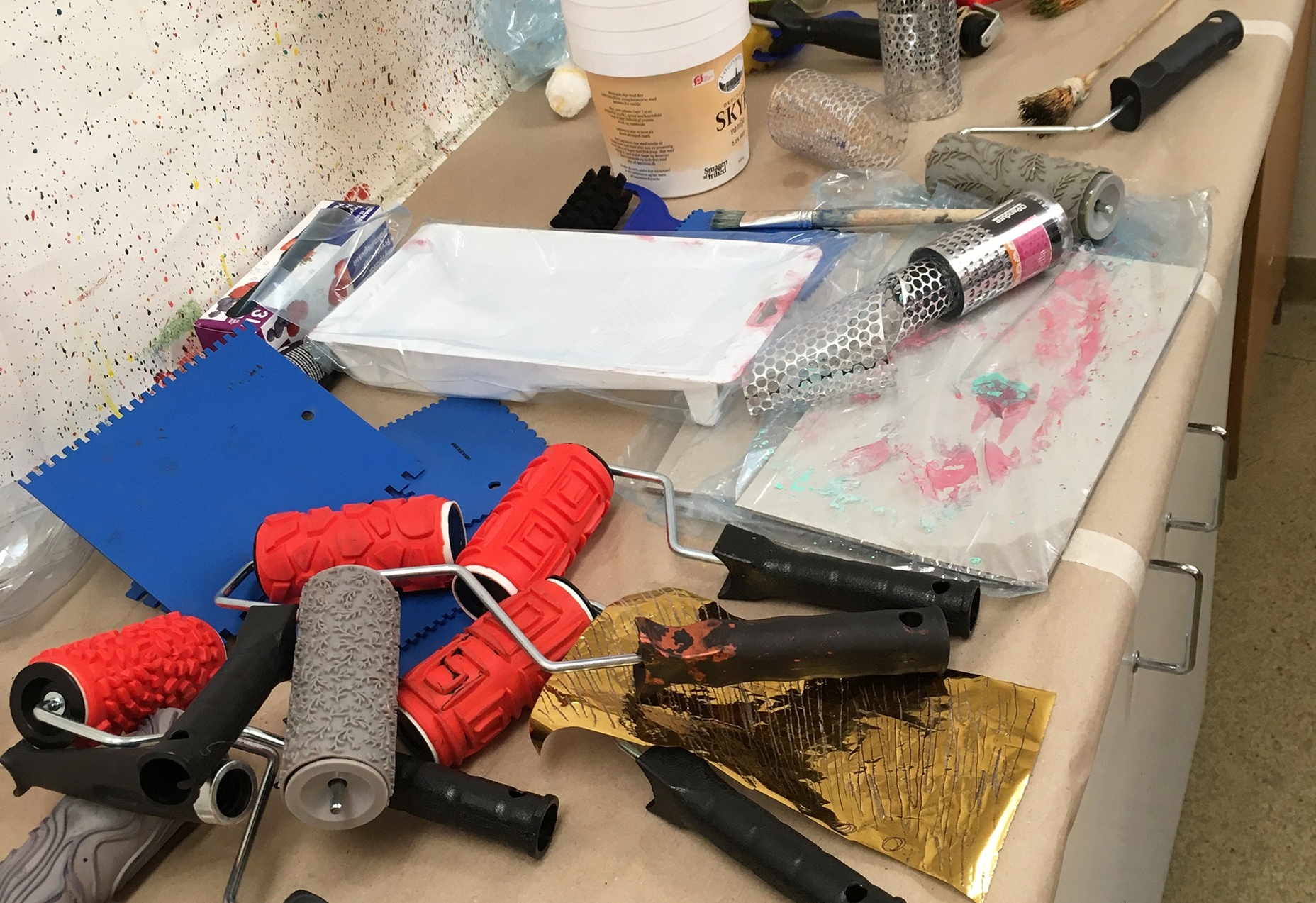 Paperin värjäyspajoissa kokeilimme opettajamme mukaan hieman lapsellisiakin tapoja värjätä paperia. Sielläkin oli asenteena se, että ei olla niin vakavia, kokeillaan ennakkoluulottomasti mitä syntyy. Kaadoimme väriä märälle paperille ja kääntelimme sitä tehden valumia. Telasimme erilaisia kuvioita papereille, sekoitimme liisteriä ja akryyliväriä ja levitimme seoksen paperille. Sitä sitten muotoilimme pyyhkien paperia erilaisilla lastoilla. Saimme monta hyvää ideaa tulevalle opetuskaudelle.