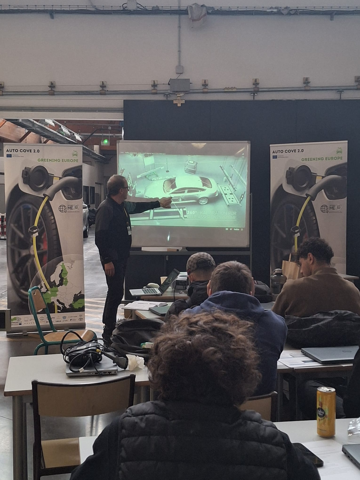 28.–29.10.2025 Omnian ADAS-asiantuntijat Antti Järvenpää ja Matti Rämö veivät pilotoinnit Ranskan partnerioppilaitokseen SEPR:ään, jossa he opettivat kuljettajaa avustavien järjestelmien (ADAS) testausta. Opiskelijat pääsivät tekemään auton etukameran staattisen ja dynaamisen kalibroinnin sekä tutustumaan Electude-oppimisalustalle luotuun materiaaliin.